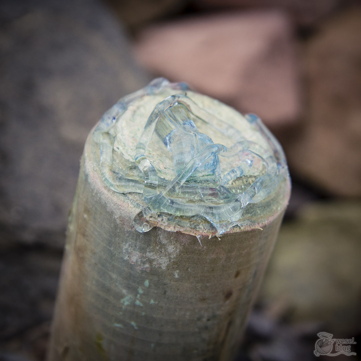 Vorsichtig den Pilzkopf von der Holzpalisade nehmen und vom Nylonstrumpf befreien. Die Holzpalisade wird natürlich auch wieder ausgepackt.Jetzt muss nur noch die Holzpalisade fest mit dem Pilzkopf verbunden werden. Dazu entweder auch wieder etwas Beton anrühren und die Holzpalisade damit einmörteln oder alternativ den Hybridkleber dazu verwenden.