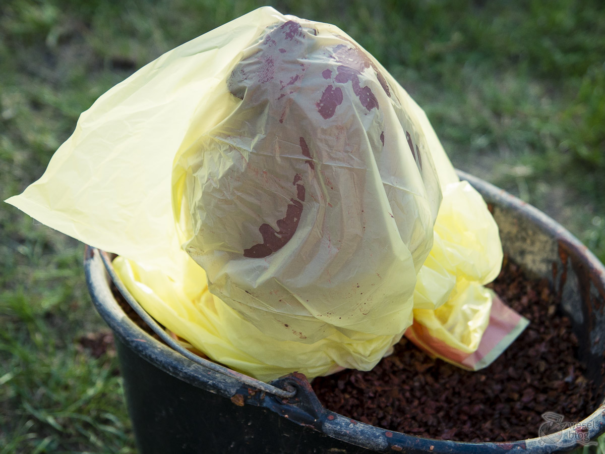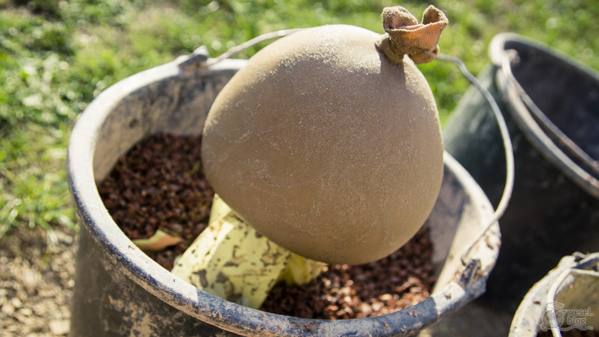 Die Holzpalisade in eine Mülltüte einpacken und in einen Eimer mit Sand, Splitt, Schotter oder ähnlichem stecken – Wenn das alles nicht zur Hand ist, einfach in den Gartenboden stecken. Den Fertigmörtel anrühren oder alternativ aus 3 Teilen Sand und 1 Teil Zement einen nicht zu dicken Beton mischen. Optional noch das Farbpulver einrühren.