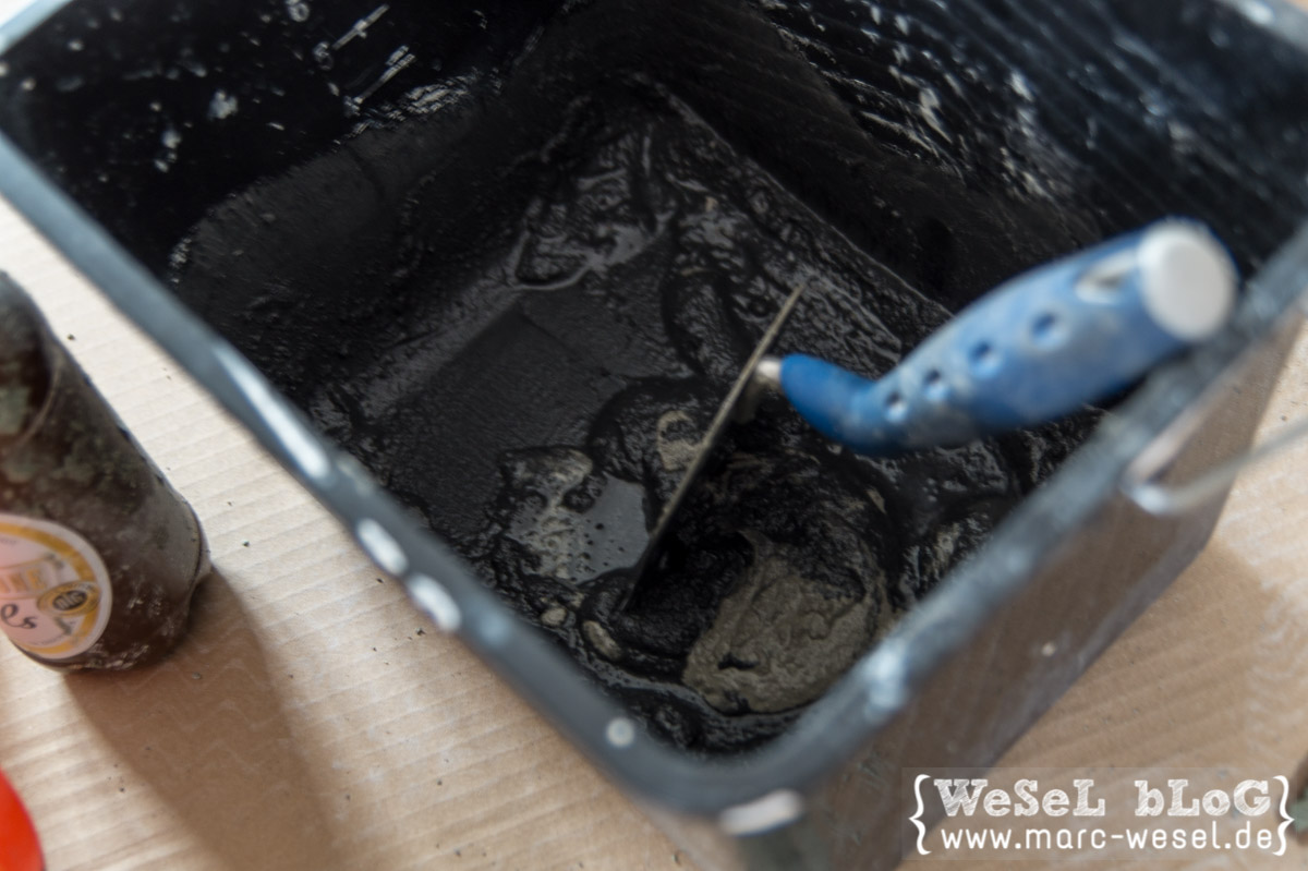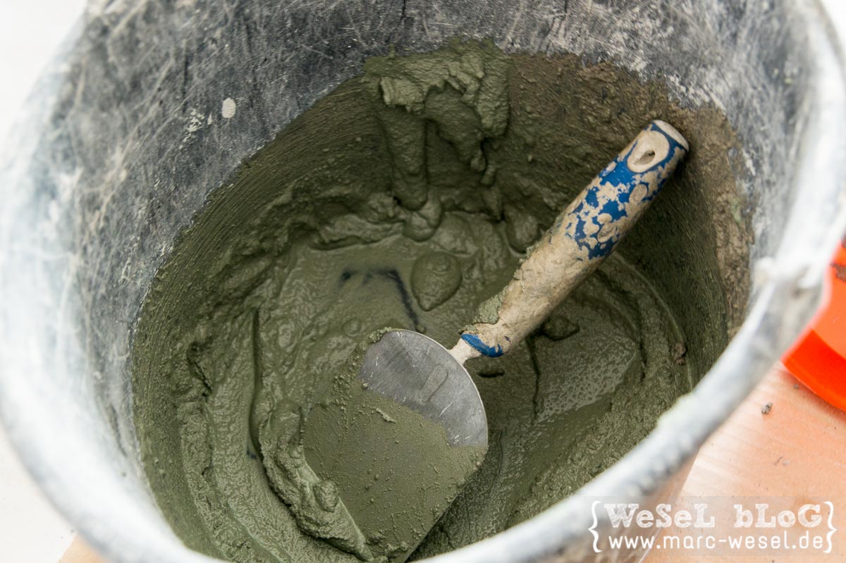 Farbpigmente zugeben und gut durchrühren. Immer etwas warten (mehrere Minuten), es dauert bis die Farbpigmente ihre Wirkung richtig zeigen. Je nach Geschmack weiter Farbpigmente einrühren, bis die Tönung passt. Da der Mörtel ja eine graue Grundfarbe hat, werden vor allem helle Farben natürlich nicht richtig knallig und beim Trocknen auch eher nochmal etwas heller.