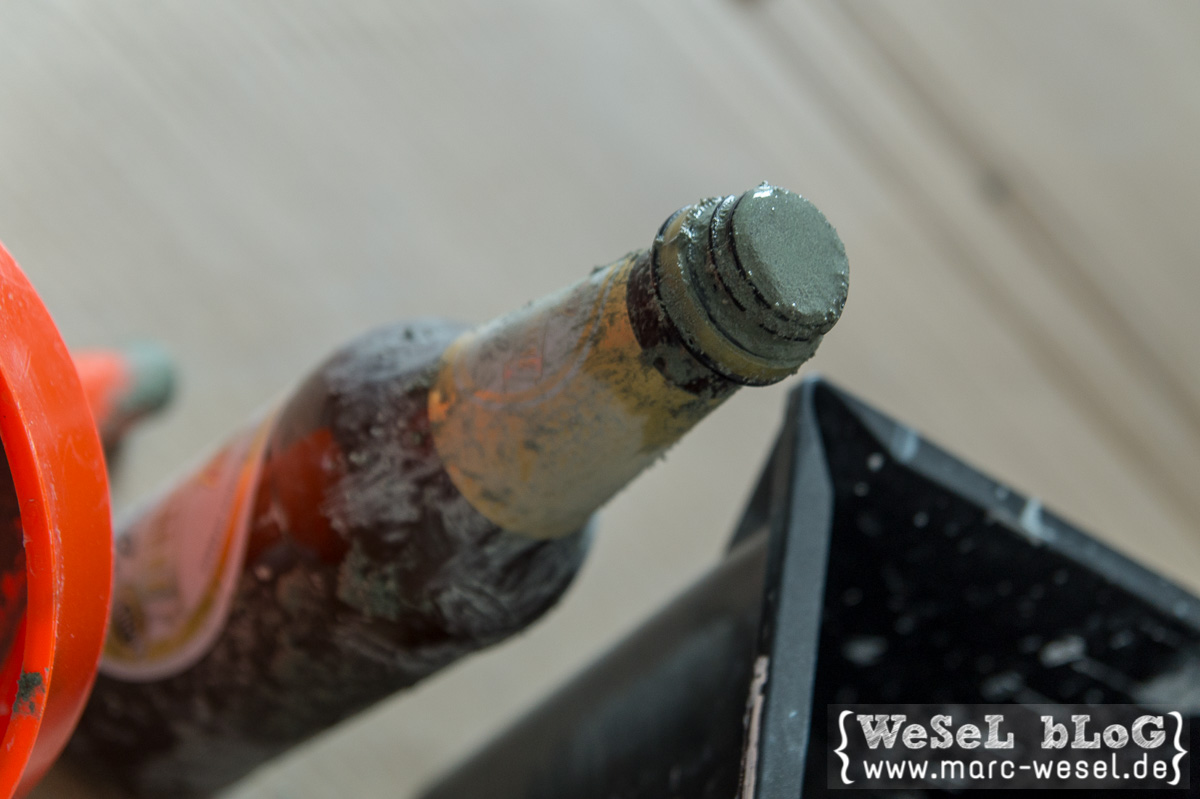 Zwischendurch die Flasche immer mal wieder vorschichtig etwas auf den Boden stampfen, damit der Mörtel schön dicht wird und die Luft heraus geht.