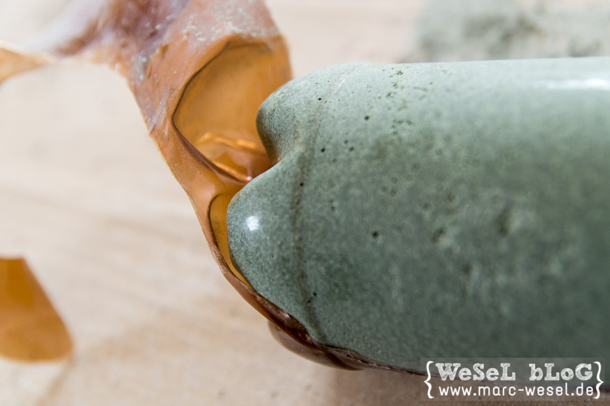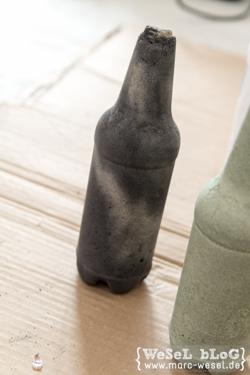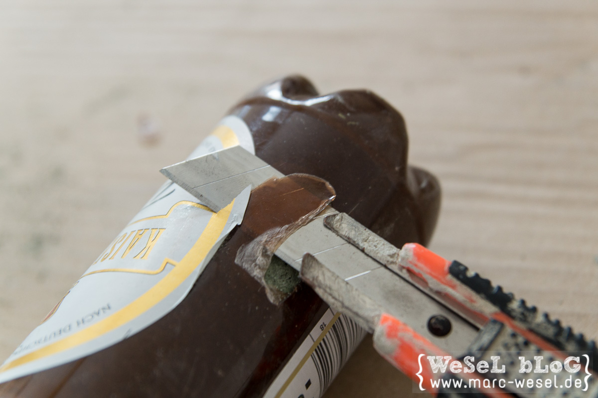 Nach der Trocknungsphase mit einem scharfen und spitzen Cutter-Messer vorsichtig die Bierflasche anritzen und die erste Ecke entfernen. Jetzt mit der Klinge zwischen den Beton und die Plastikhaut gehen und vorsichtig Stück für Stück einschneiden und entfernen. Vor allem oben am Hals etwas aufpassen, da dort auch das Plastik kräftiger wird.