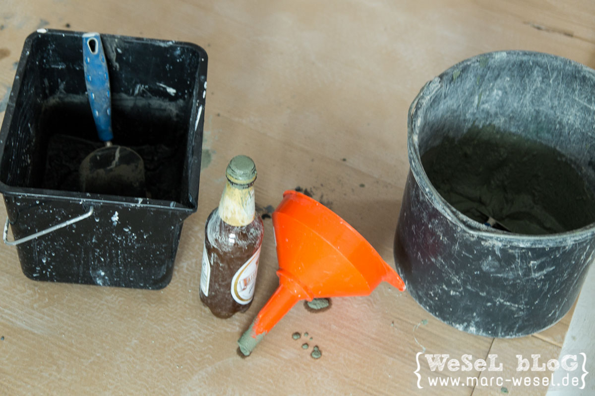 Für die Bierflaschen zuerst Zementmörtel anrühren. In der Konsistenz etwas flüssiger halten, dadurch lässt sich der Mörtel leichter einfüllen. Den Mörtel in so viel Gefäße aufteilen, wie ihr verschiedene Farben herstellen wollt.