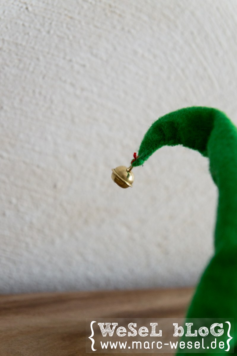 Mit der Vorlage aus dem Filz den Grundkörper für die Mütze ausschneiden und mit einem einfachen Saumstich zusammennähen – nochmals vielen Dank an meine Göttergattin. Durch leichtes Variieren des Zuges auf dem Faden ergibt sich diese wunderschöne Krümmung. An das Ende der Mützen wird jeweils ein kleines Metallglöckchen angenäht.